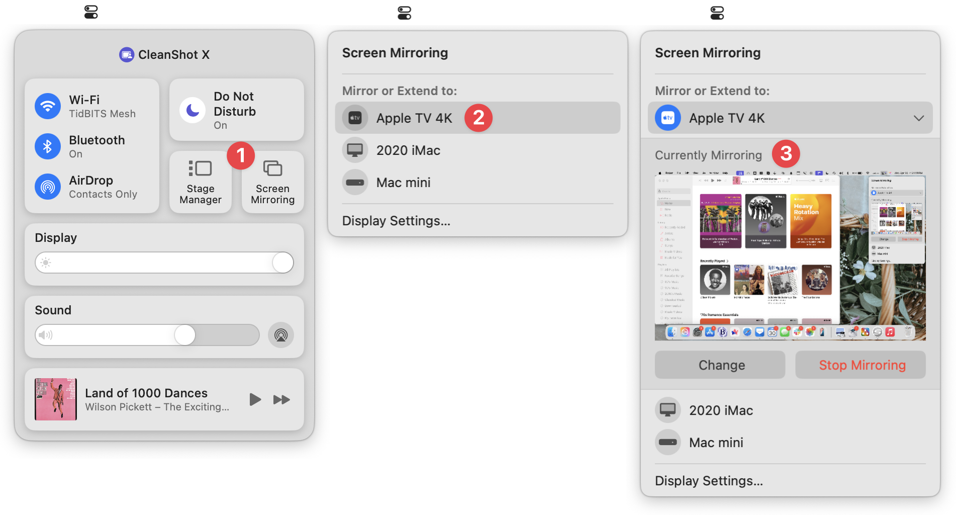 Apple’s recommended method for mirroring your screen is to open Control Center by clicking its icon at the right side of the menu bar, click Screen Mirroring, and select the desired Apple TV or Mac from the list. Once you do that, your Mac’s screen will appear on the external display.