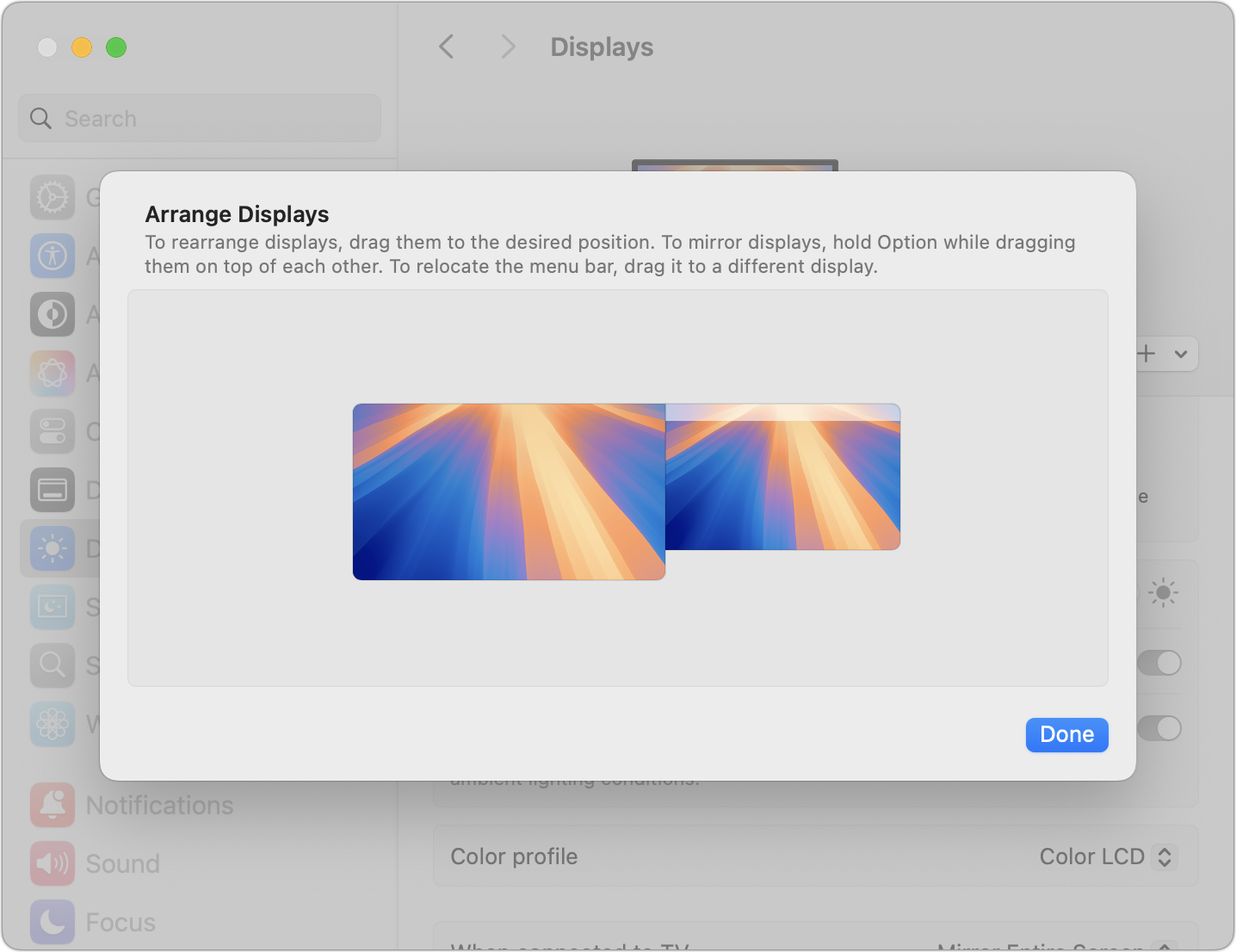 Once you have your desired resolution, you need to arrange the screens appropriately. It’s usually best to match the real-world positioning, so if your second display sits to the left of your Mac, move its representation there so dragging windows and other items on the extended desktop works as you expect. Click the Arrange button, drag the second display into the desired location, and click Done.