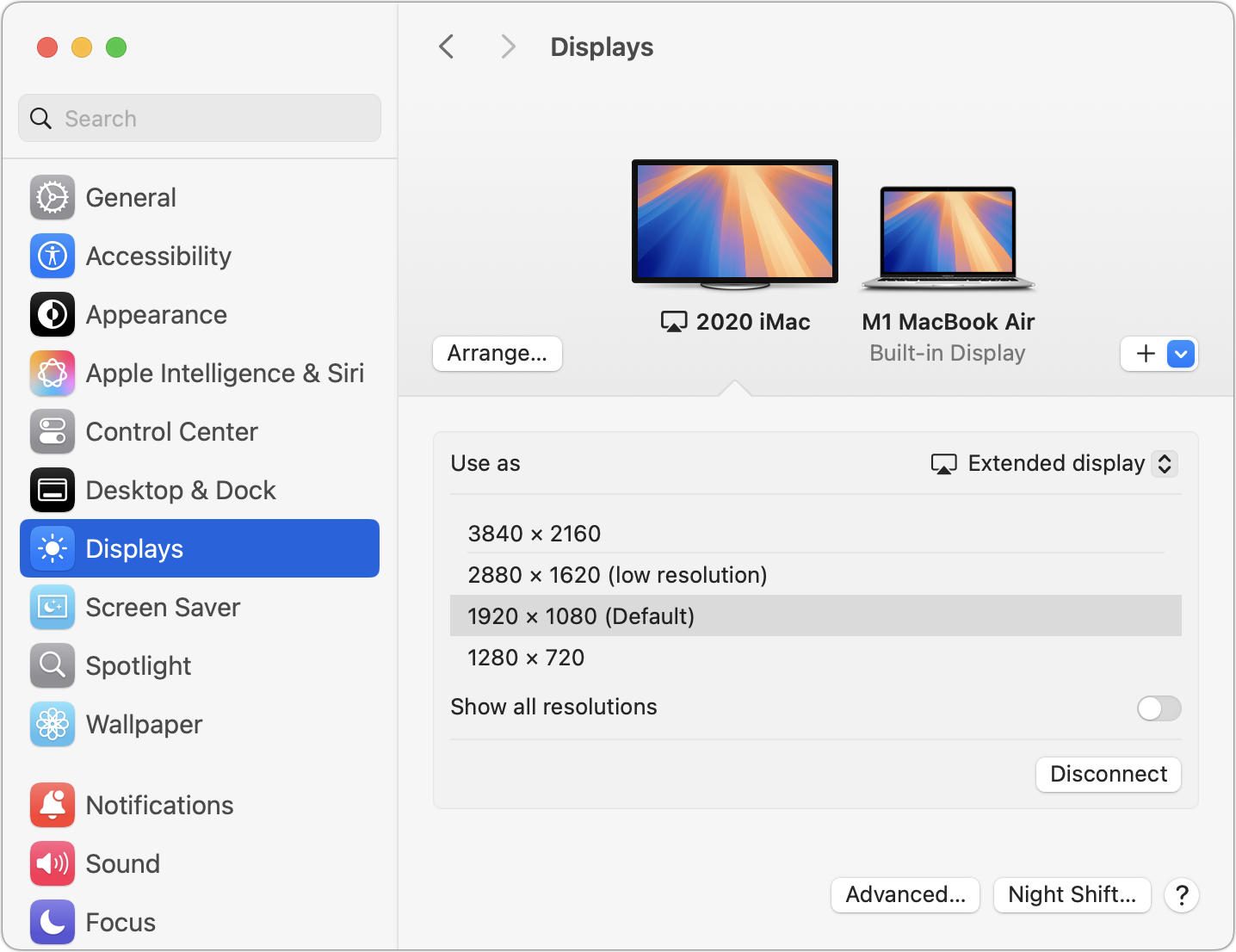 However, it may not display at a usable resolution. You control the resolution in System Settings > Displays, and you can jump there by clicking Display Settings in either of the two rightmost windows shown above. In the Displays settings screen, from the Optimize For pop-up menu, choose either your Mac or the external display. If you choose the external display, you can select from all available resolutions.