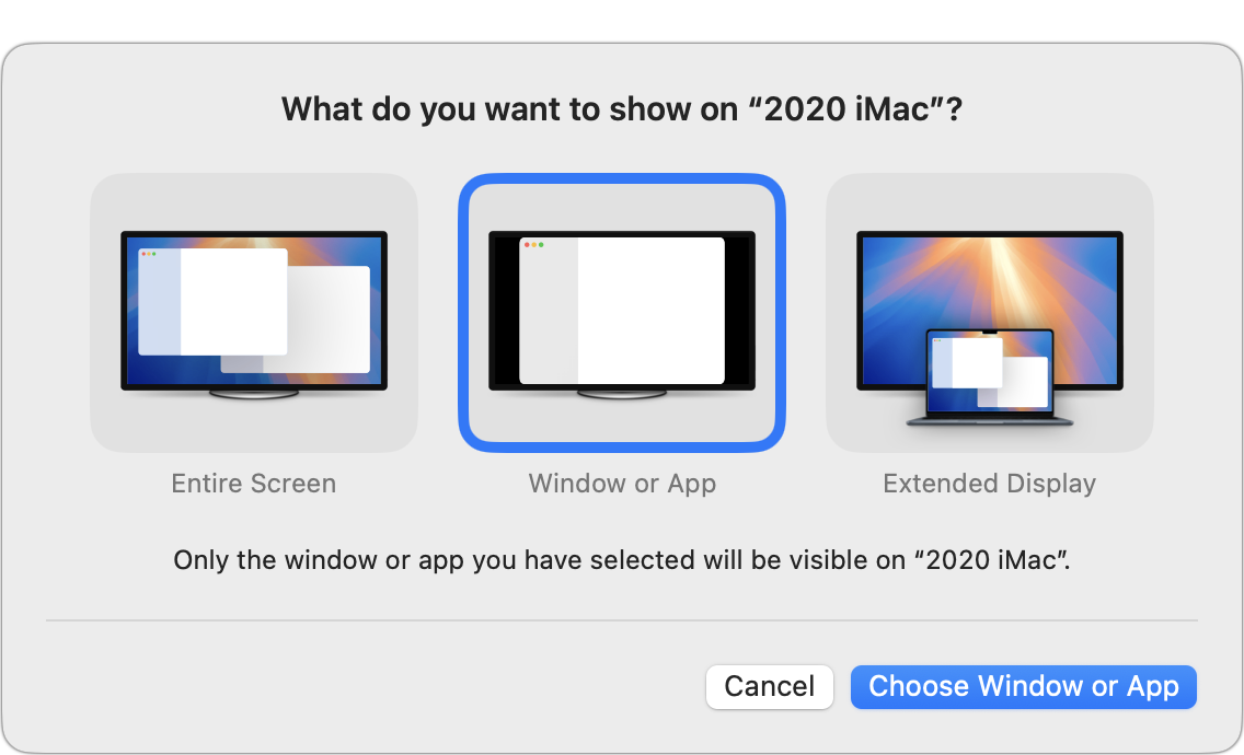 To mirror one window or all the windows in an app, open Control Center, click Screen Mirroring, select the destination display, and then click Change or Choose Content. In the dialog that appears, select Window or App and click Choose Window or App.