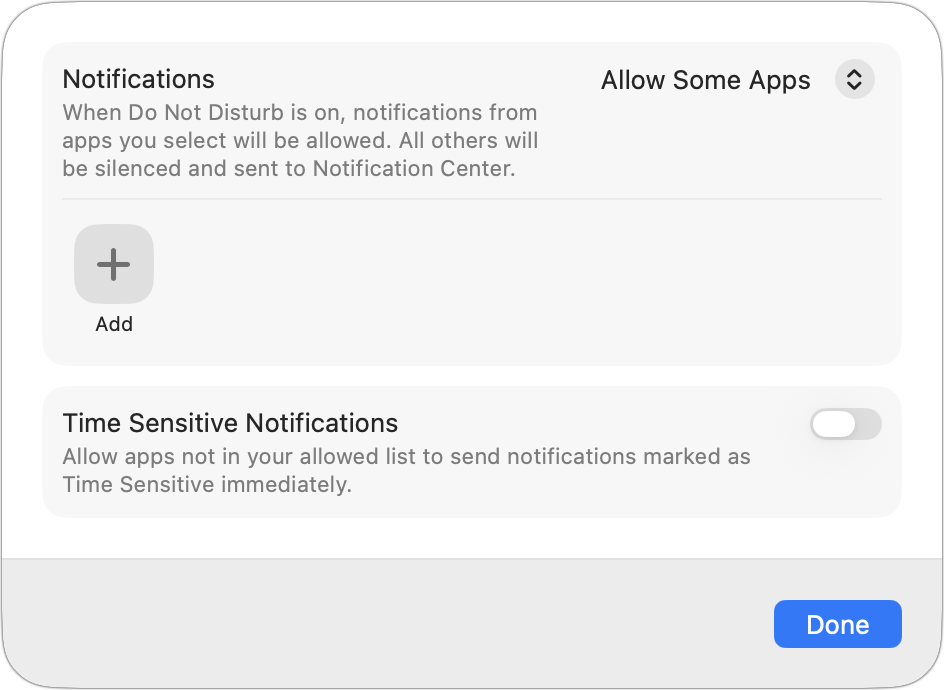 Choose allowed people: Decide whether to allow or silence notifications from specific people. You can also specify whether phone calls from certain groups (Allowed People, Favorites, Contacts, or Contacts groups) can break through.