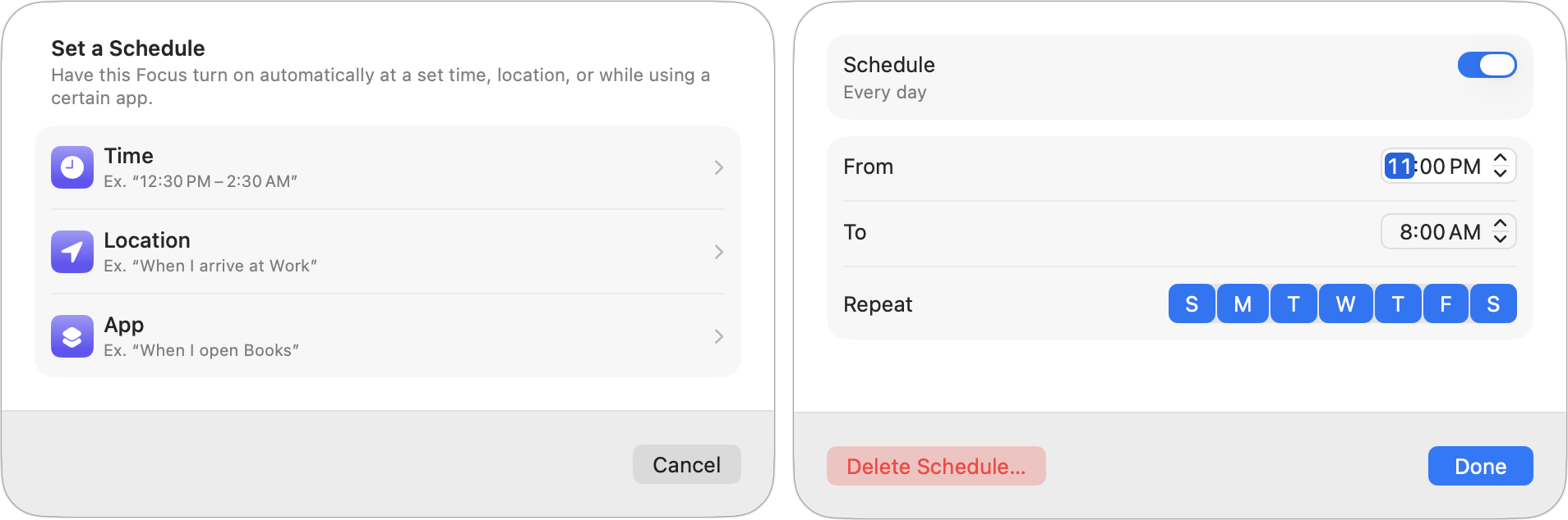 3. Set a schedule: Have the Focus turn on at certain times, locations (on when you arrive, off when you leave), or when using specific apps (but not when apps are in the background). App-based triggers are useful for presentations, live performances, and games. A Smart Activation option on the iPhone can automatically turn on a Focus based on your location, app usage, and time of day.