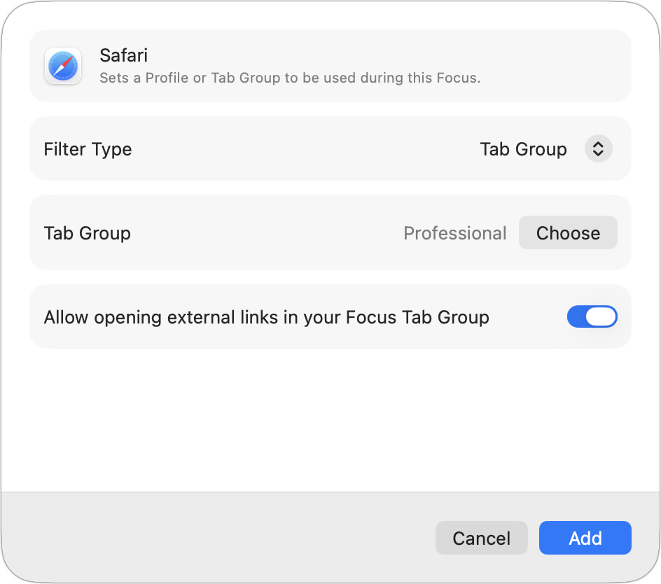 4. Add Focus Filters: Customize how Calendar, Mail, Messages, Safari, and others behave when the Focus is active—for example, showing only certain Safari tab groups and your work email accounts during a Professional Focus.