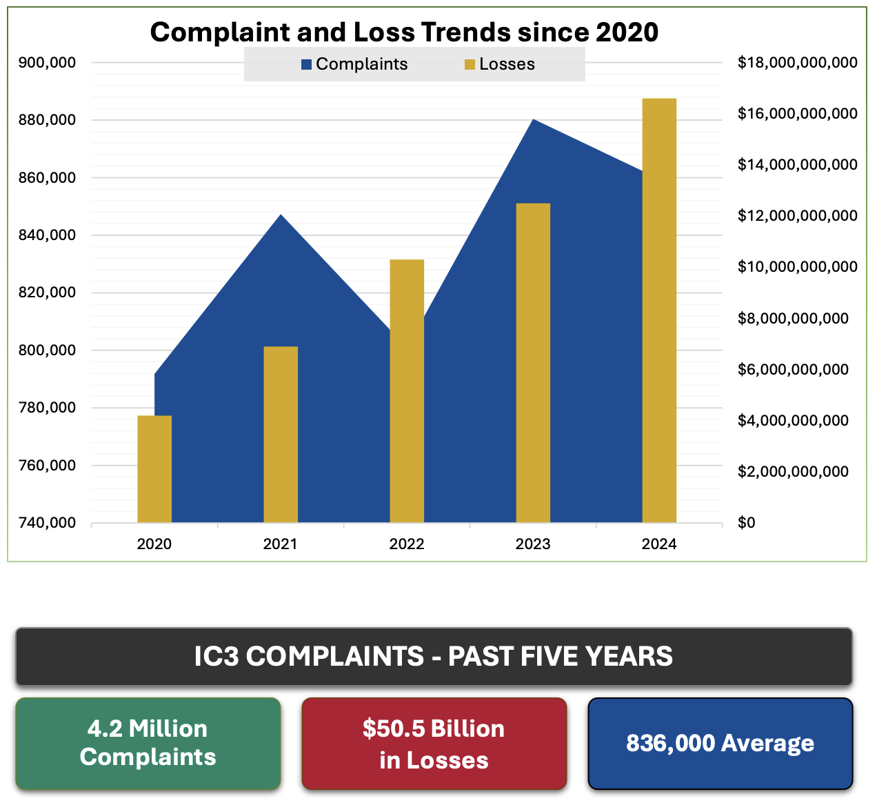 According to the FBI’s Internet Crime Complaint Center (IC3), cybercrime-related losses from 2020 through 2024 are estimated at $50.5 billion, with IC3 receiving 4.2 million complaints. Most concerning is the rising trend in the frequency and severity of these attacks.