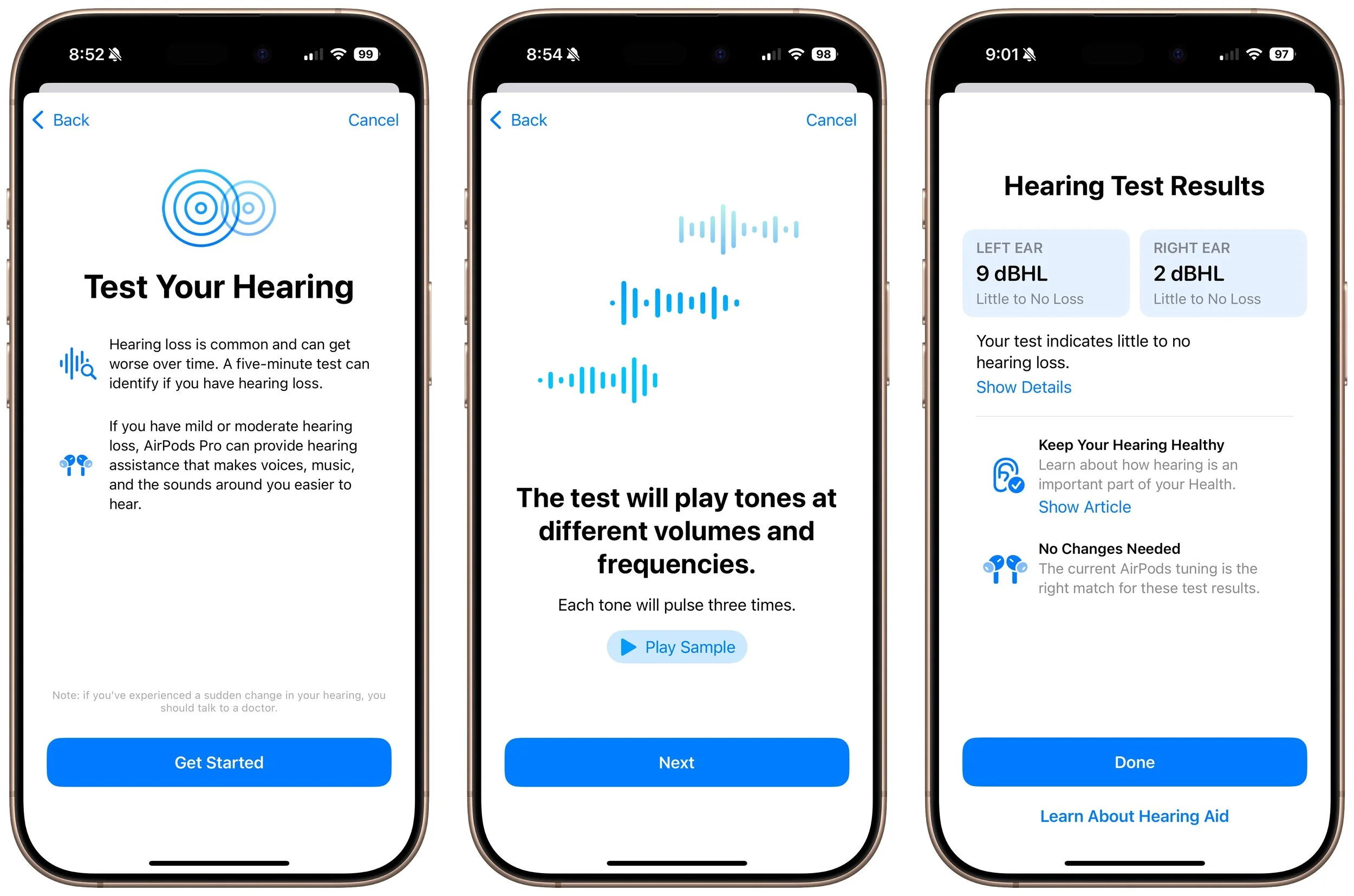 The Hearing Test has three parts: setup, the actual test, and presenting the results. In the setup phase, the iPhone guides you through finding a quiet place to take the test, inserting your AirPods Pro correctly, and testing the fit.