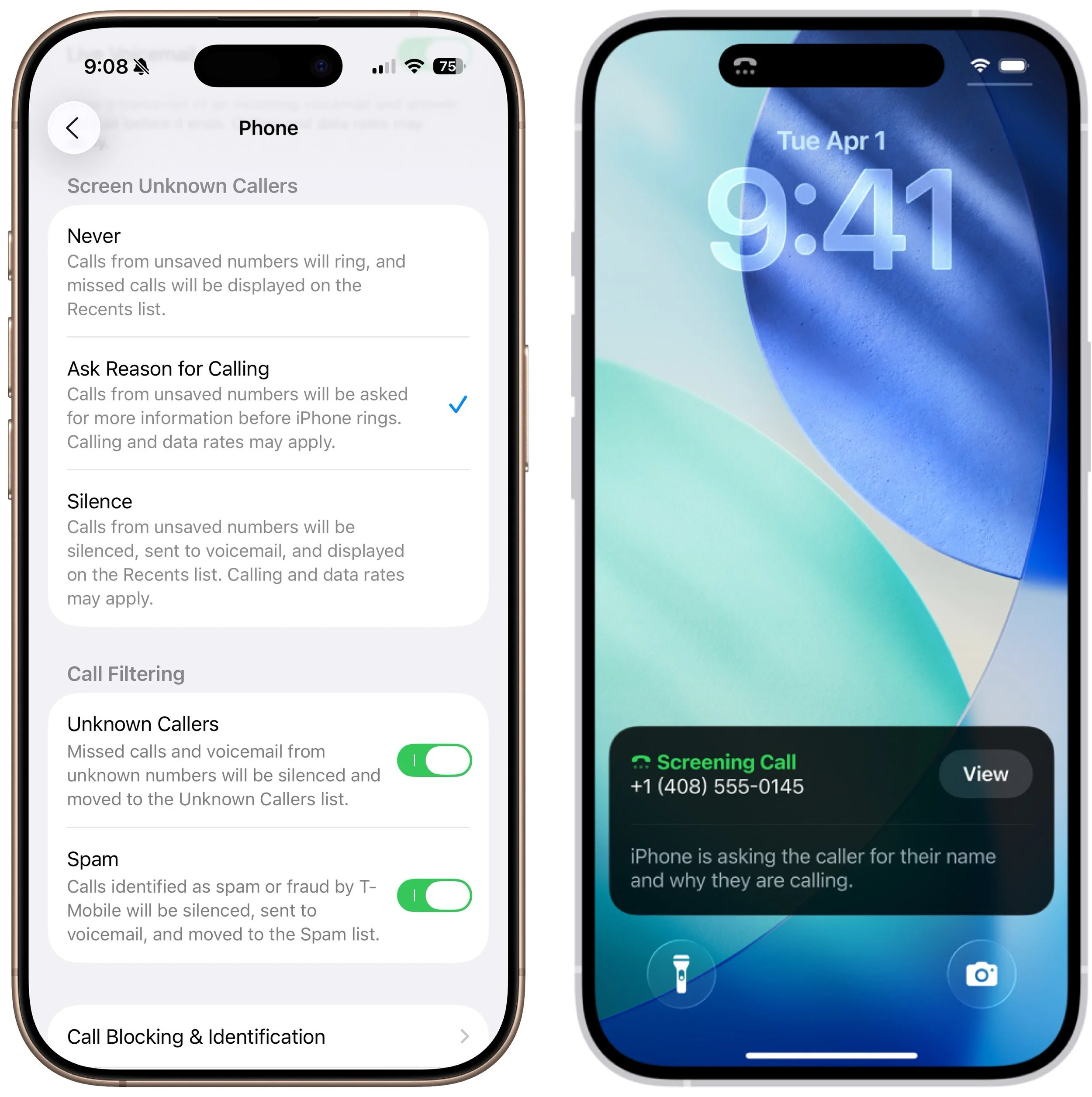 A new Call Screening feature, configurable in Settings > Apps > Phone > Screen Unknown Callers, intercepts incoming calls from unknown numbers and prompts the caller to “state their name and reason for calling” before the iPhone even rings. If the caller responds, you’ll see a transcript or snippet of their response, allowing you to decide whether to answer or ignore the call. In our experience, it mainly causes spammers and telemarketers to hang up instantly, which is equally effective.