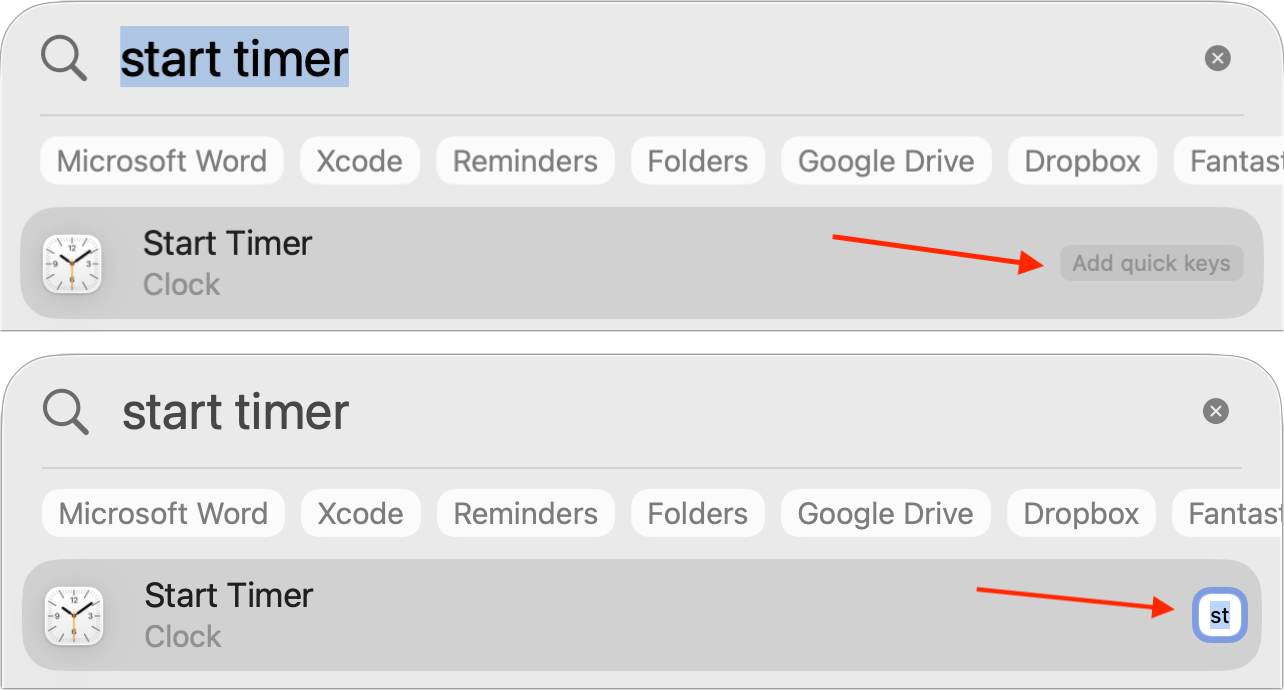 For actions you perform regularly, you can speed things up by defining Quick Keys, which are character sequence shortcuts that stand in for the full action name. For example, you could set it up so that typing st in Spotlight expands to start timer.