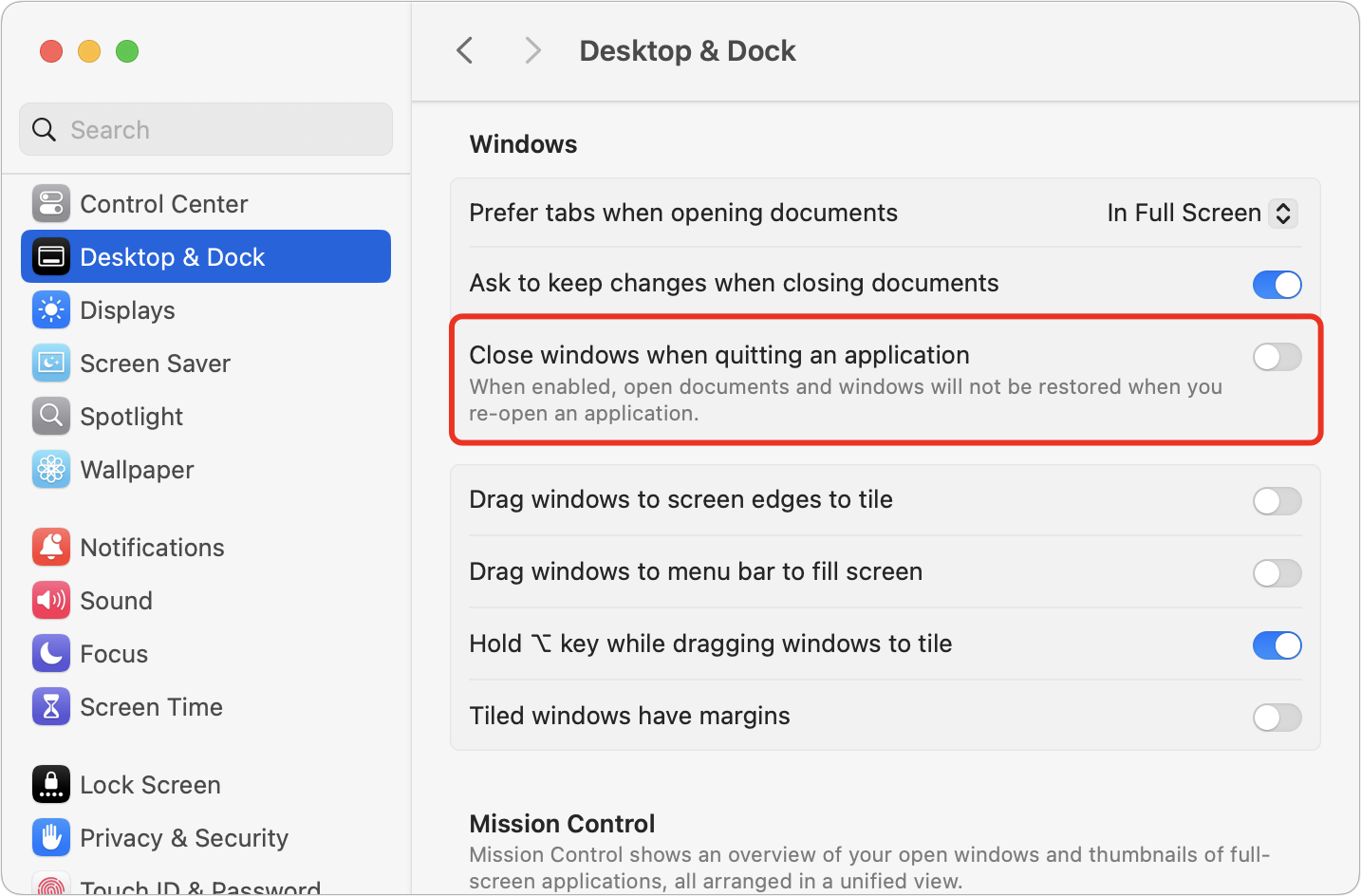 Resume also governs what happens each time you quit and reopen an individual app. This behavior is controlled by a switch in System Settings > Desktop & Dock under the Windows section, labeled “Close windows when quitting an application.”